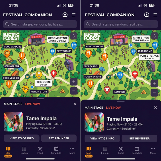 Custom event overlays with precision navigation. Find stages, food, facilities, and friends.